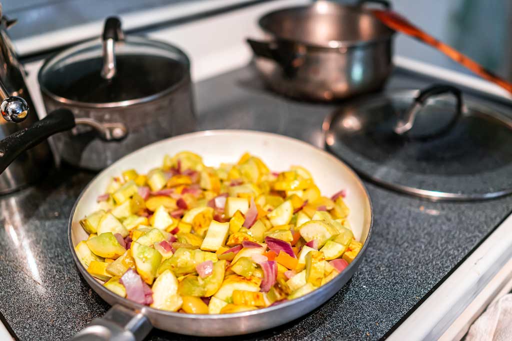 Place pan over medium heat and place remaining 2 tablespoons olive oil in pan. When hot, add onion and garlic and saute 3 to 4 minutes, stirring constantly, until onion slices are softened. Add squash, zucchini and pepper slices; stir constantly, saute vegetables until tender, approximately 5 to 7 minutes.