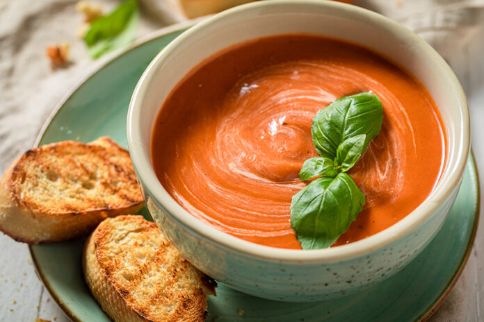 - Heat a large Dutch oven over medium heat. Add butter and olive oil; once butter is melted, add diced onions. Cook onions until translucent. Add garlic and cook for an additional 2 minutes. Add tomatoes and tomato juice and stir. Add sugar — this is added to reduce the acidity of the tomatoes. Add chicken base and ground pepper and bring to a simmer. Remove from heat.