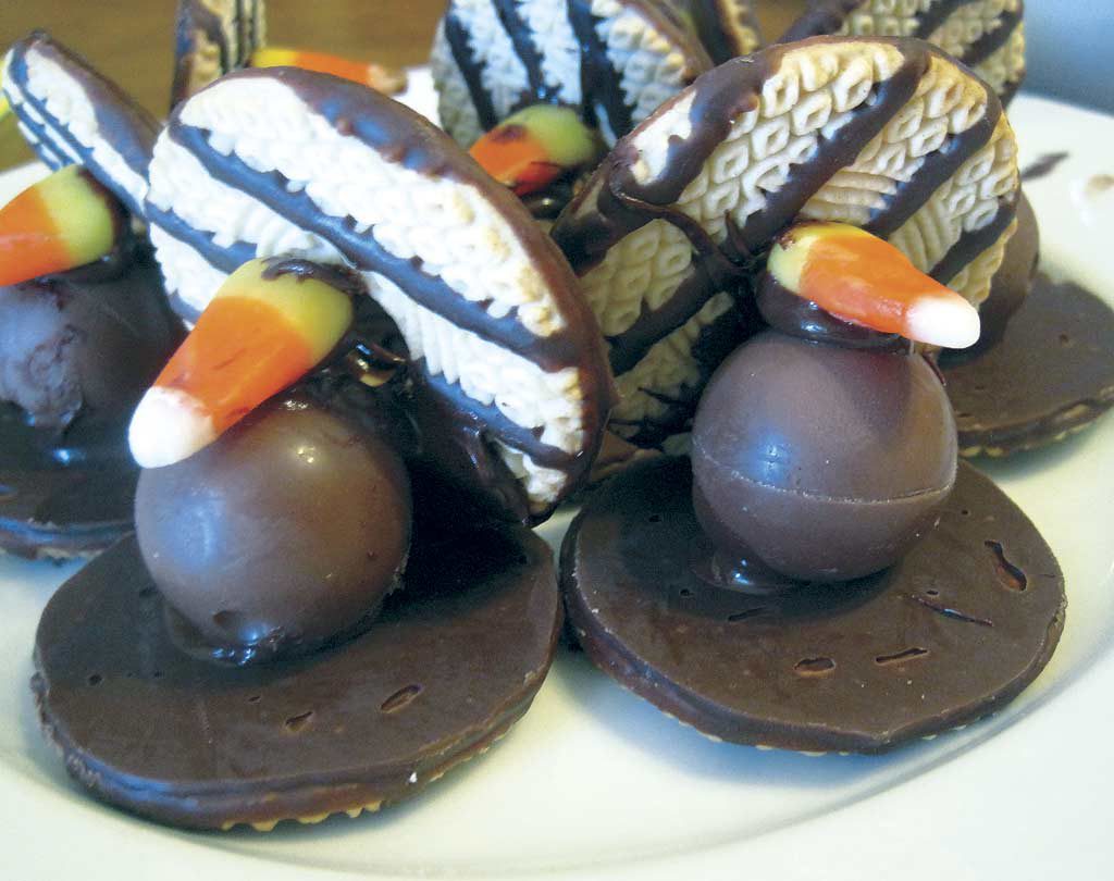 - Dip the yellow back and edge of the candy corn into the chocolate and then place on top of the chocolate ball and against the striped cookie.