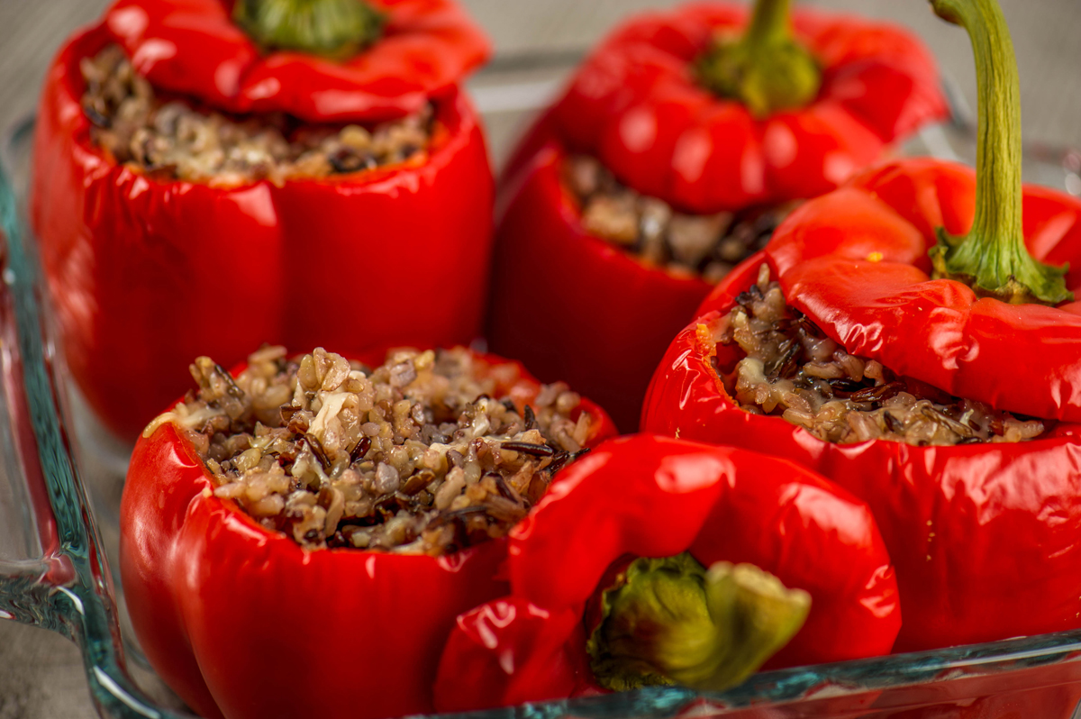 Cut off the tops from the bell peppers just below the “shoulders” to make lids. Cut out the white membranes from the insides of the peppers and shake out the seeds. Trim the white membranes from the lids, too.
