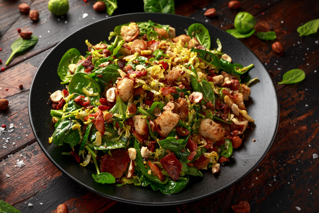 - Add the roasted sprouts, bacon mixture, cranberries and cheese to the hazelnuts and toss well. This salad is best served warm.