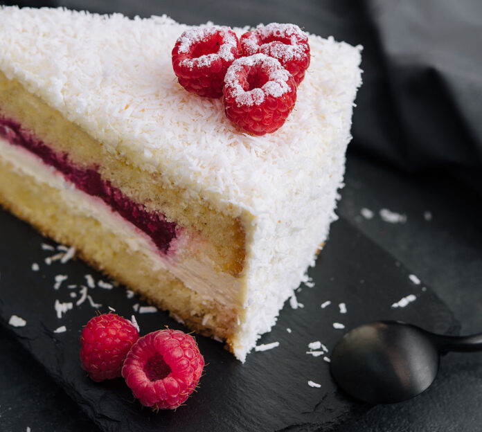Make cake according to directions and let cool. While the cake cools, make the pastry cream according to the recipe. When the cake is cooled, spread the pastry cream onto one layer, top with raspberry jam, and place the other layer on top. Sprinkle top with coconut flakes, top with raspberries and spring with confectioners sugar. Refrigerate until ready to serve.