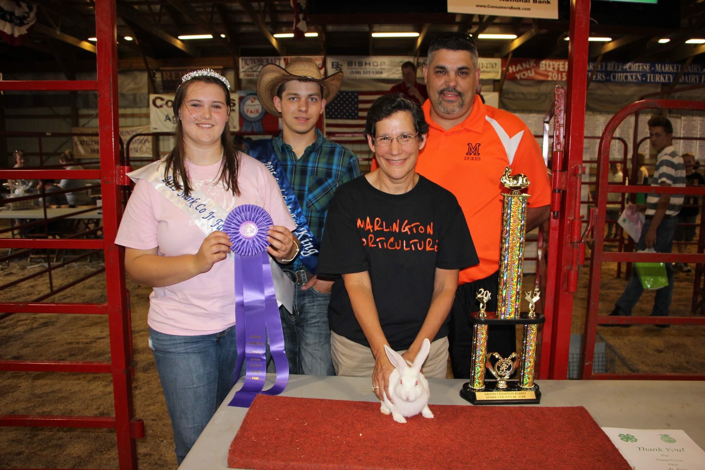 Averie Elsass’ (not pictured) champion rabbit fryer sold for $350 to Lee and Carolyn Gabric (right) and Friends to elect Thomas Hippley for Marlington School Board. They were joined by fair king and queen Matt Moberly and Amber Buzaki.