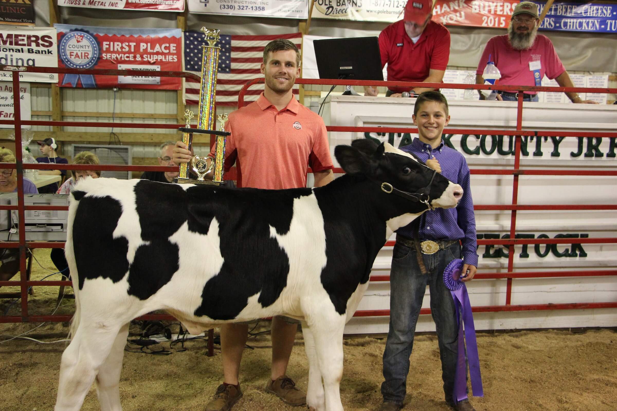 John Popick sold his grand champion dairy feeder calf for $5 a pound to Hunter Palmer of Paris and Washington Insurance.