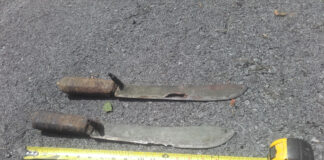 Item No. 1289 is approximately 12 inches by 4 inches with a hollow pipe handle. It’s 100% steel with sturdy rivets attaching the handle to the knife.