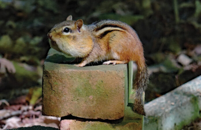 As its species name, striatus, implies, the chipmunk is a rodent named for its conspicuous markings. A prominent white stripe down each of its sides bordered by black and topped off by a dark stripe down the center of its back gives the impression of racing stripes. Light-colored lines above and below the eyes complete the outfit. Measuring just 10 inches in length, including the tail, the chipmunk’s diminutive size does not detract from its larger-than-life personality.