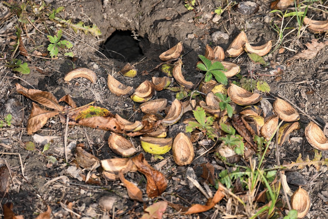 Chipmunk abodes become obvious in autumn as accumulations of chewed nuts or hulls accumulate at their entrance. In general, chipmunks are solitary and highly territorial, interacting with males only during breeding season.