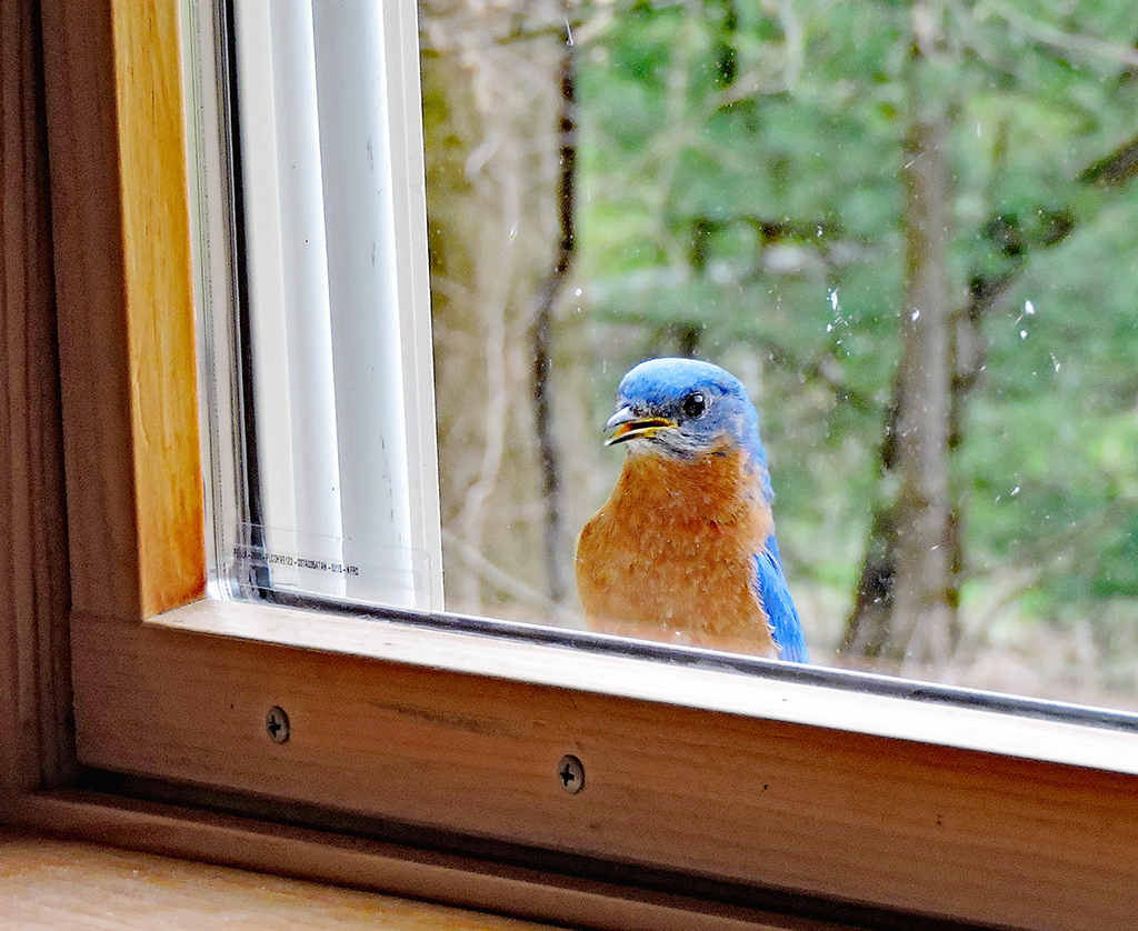 There are several species of birds that regularly fight their reflections, notably robins, cardinals, towhees and a couple species of sparrows. Yet, our most irritating experience with this behavior happened with a male eastern bluebird, and it lasted for two years throughout its breeding seasons. We love our bluebirds, don’t get me wrong, but the tenacity of this male had us all crazy, including our dogs. Not only did he visit practically every window of our house, but he spent hours on our vehicles, battling his reflection in the side mirrors. To make matters worse, he would defecate constantly, coating the cars with streams of whitewash which had to be washed off daily. Covering the windows in our house or moving the vehicles to different locations on our farm made little difference. We were so relieved to see him go after rearing 2 broods in our box during the first year. The next year, we couldn’t believe it when, there he was, back again at his shenanigans. Although we maintain several successful bluebird boxes on our property, we had never experienced this behavior from a bluebird and hopefully, never will again.
