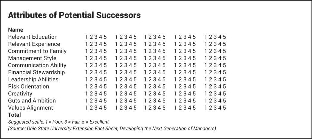 Interviewing potential successors takes time and energy. It’s helpful to take notes about each interested person. These notes will be helpful as you reflect on the discussions. Some may find it helpful to rank each potential successor against a variety of items. I’m sharing a table from the Ohio State University Extension Fact Sheet, Developing the Next Generation of Managers.