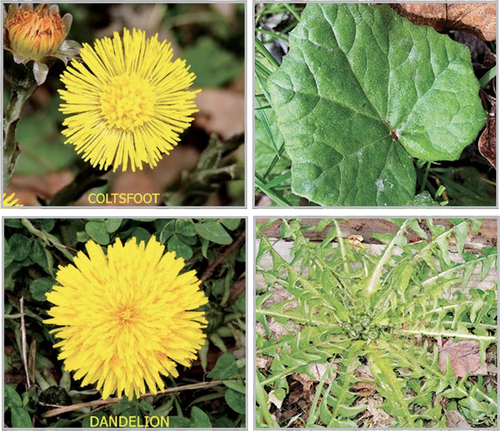 Although they are often confused for one another, coltsfoot and dandelion plants have noticeable differences. Dandelion leaves are toothed and apparent when the plant is in bloom. Coltsfoot leaves appear after the plant has gone to seed, looking loosely like a colt's foot. (Tami Gingrich photos, Linda Gilbert photo of coltsfoot leaf)