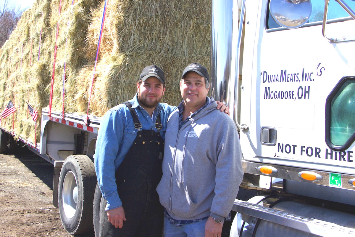 Daniel Duma and his father, Dave, stand in front of a semi load of hay that will be delivered to Kansas, March 24, from Duma Meats in Portage County. The Dumas donated 500 of their own round bales to the cause. (Catie Noyes photo)