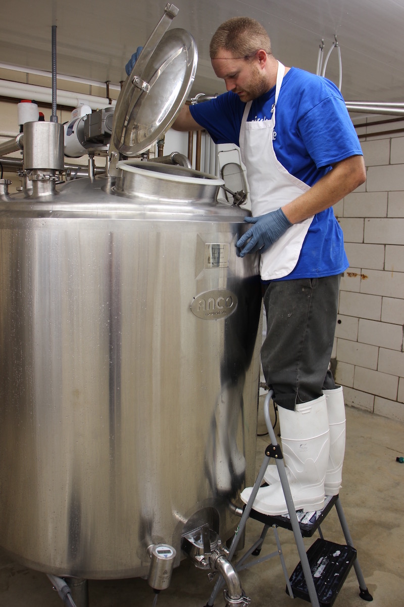 Joel Hulse checks the 300-gallon pasteurizer at Buckeye Country Creamery, in Ashland, Ohio. (Catie Noyes photo)