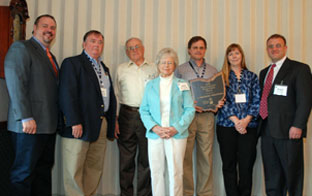 The Ohio Livestock Coalition recently honored producers for their environmental efforts. In the sheep category, Lambshire Polypays won. Pictured are (from left): Jim Chakeres, Ohio Livestock Coalition president; Rick Wallace, Ohio Sheep Improvement Association president; James, Jane, John and Betsy Anderson, Sheep Environmental Stewardship Award winners; and Roger High, Ohio Sheep Improvement Association executive director.