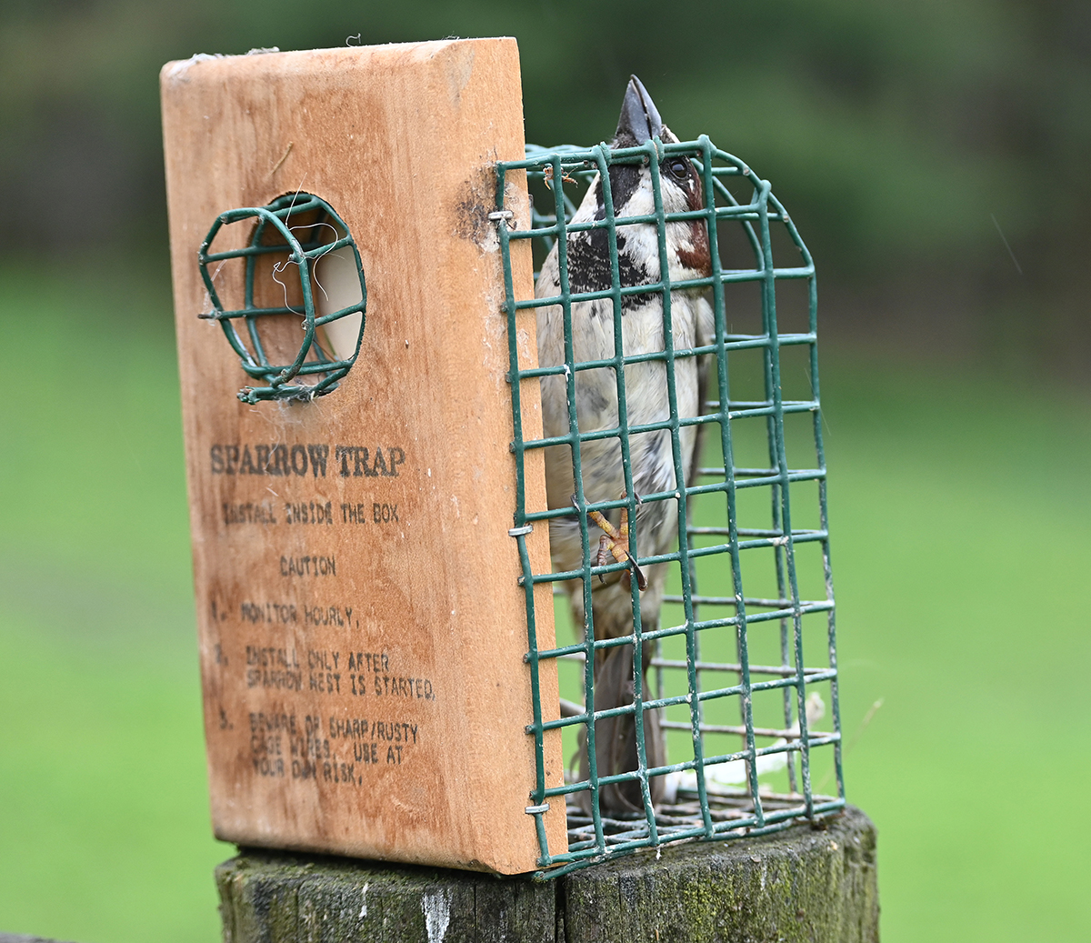 I have several bluebird boxes placed around our farm, and I am diligent about keeping the house sparrows at bay. As soon as I hear that irritating double chirp, I cringe and quickly dig out the traps. Sparrow trap styles can vary, and there are specific techniques utilized with each. A repeating sparrow trap, placed on the ground with some grain as bait, will bring in the birds. The more sparrows that enter the trap, the more likely they are to attract additional birds with their commotion. If I happen to trap a female, I will work hard to keep her alive, feeding and watering her through the night, and then popping her back into the trap the following morning. Having a female house sparrow in a trap is a sure way to bring in the males. Another trap is one that fits right inside the bluebird box, known as an in-box trap. As the bird enters the hole, it steps on a trigger that releases a bar that falls across the hole, trapping the bird inside. This type of trap is effective in getting rid of that persistent male house sparrow, however, you must be diligent in checking traps every hour or so to release any native species that might end up a prisoner.