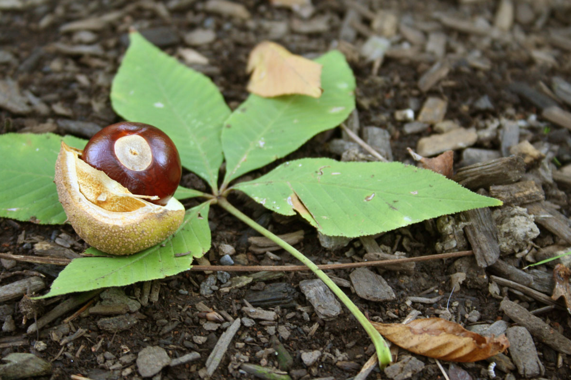 The tree is easily distinguished by its leaves and fruit. Each leaf has five leaflets. Each fruit contains one to three seeds, with a spiky golden brown to green husk encasing them.
