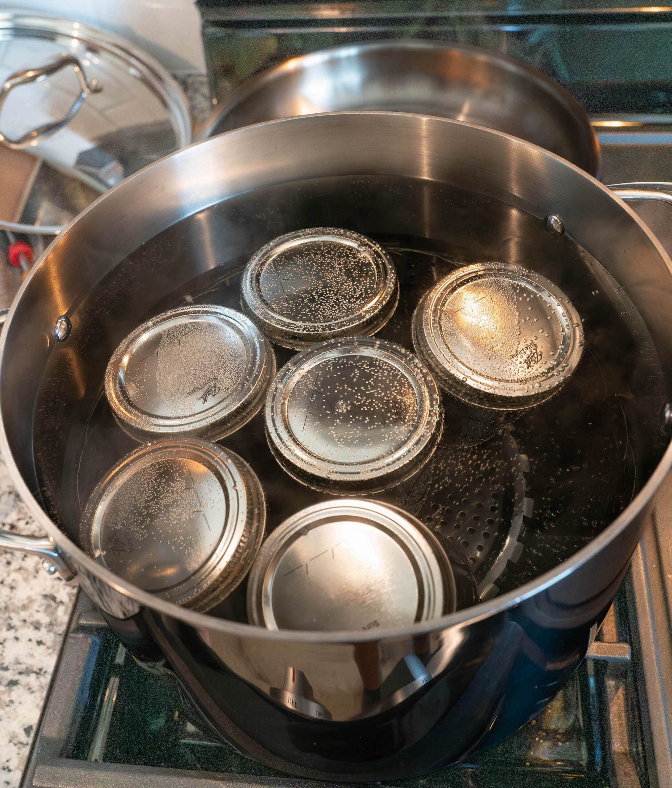 During this step, you will want to begin your water bath for the canning process. Fill up a large pot with water — enough water to submerge six half-pint jars — and place it on low heat.