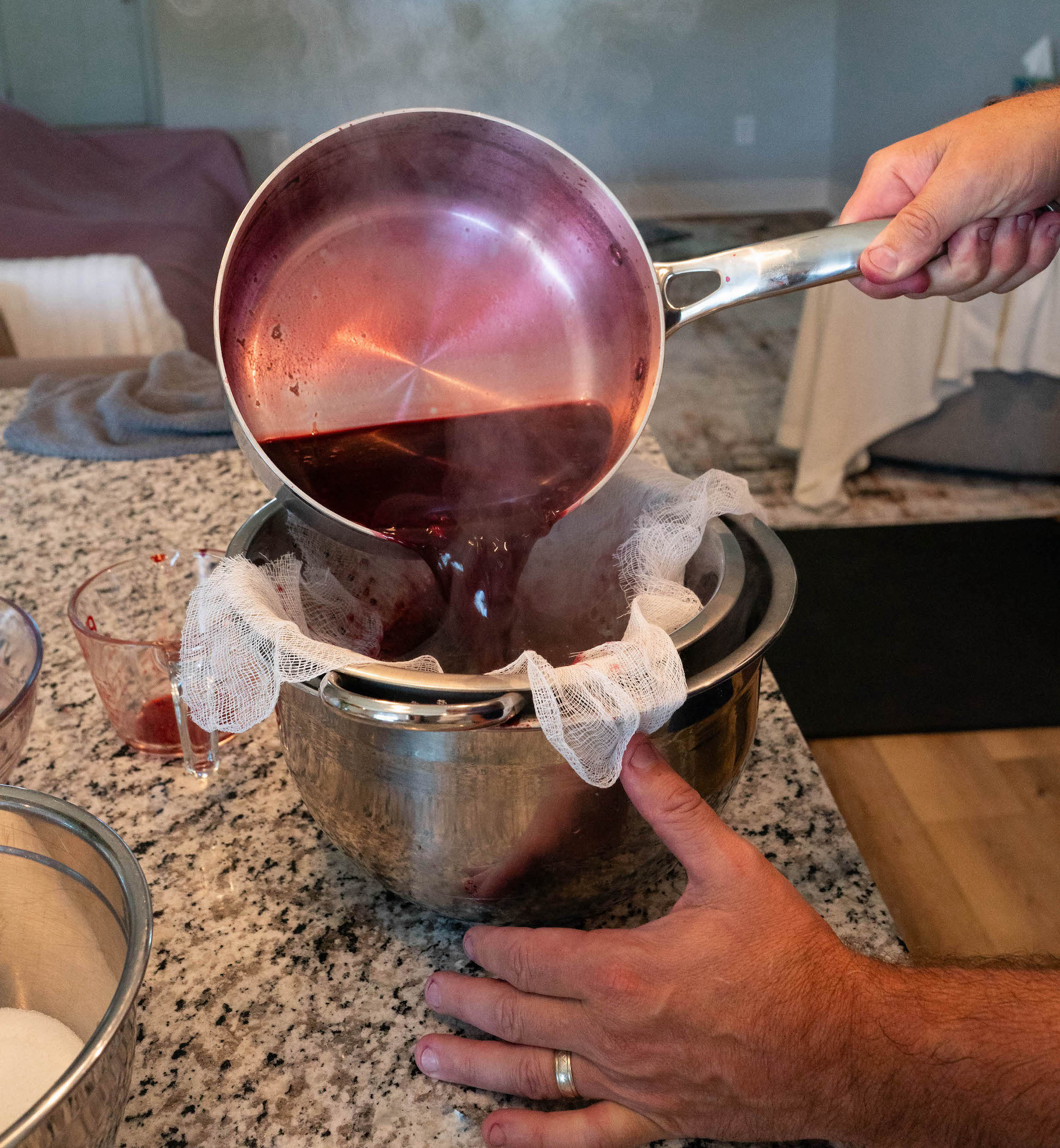 Step 4: Strain the blackberries ONLY. Place a cheesecloth over a large bowl and strain the blackberry mixture. The cheesecloth removes the blackberry seeds. Be sure to squeeze the cheesecloth a few times to make sure all of the juice comes out. Pour the juice into a liquid measuring cup. You should have 4 ½ cups of blackberry juice; if you are short, fill it with water until it is exact. (You can add up to a ½ cup of water for exact measure.) Add the blackberry juice back into the saucepan and place on medium heat.