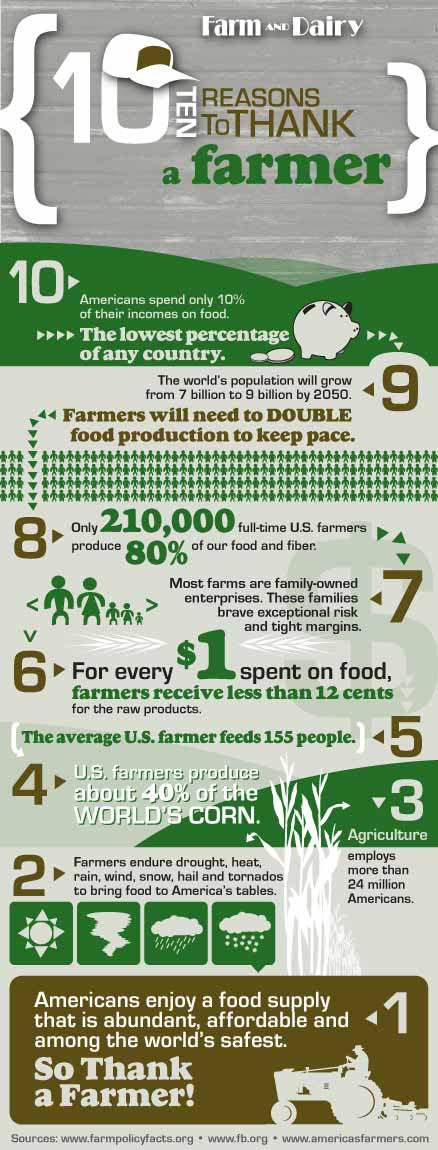 March 19 is National Agriculture Day, the day set aside to recognize and appreciate agriculture. 2013 marks the event’s 40th anniversary. To celebrate, Farm and Dairy produced an infographic, “10 Reasons to Thank a Farmer.”
