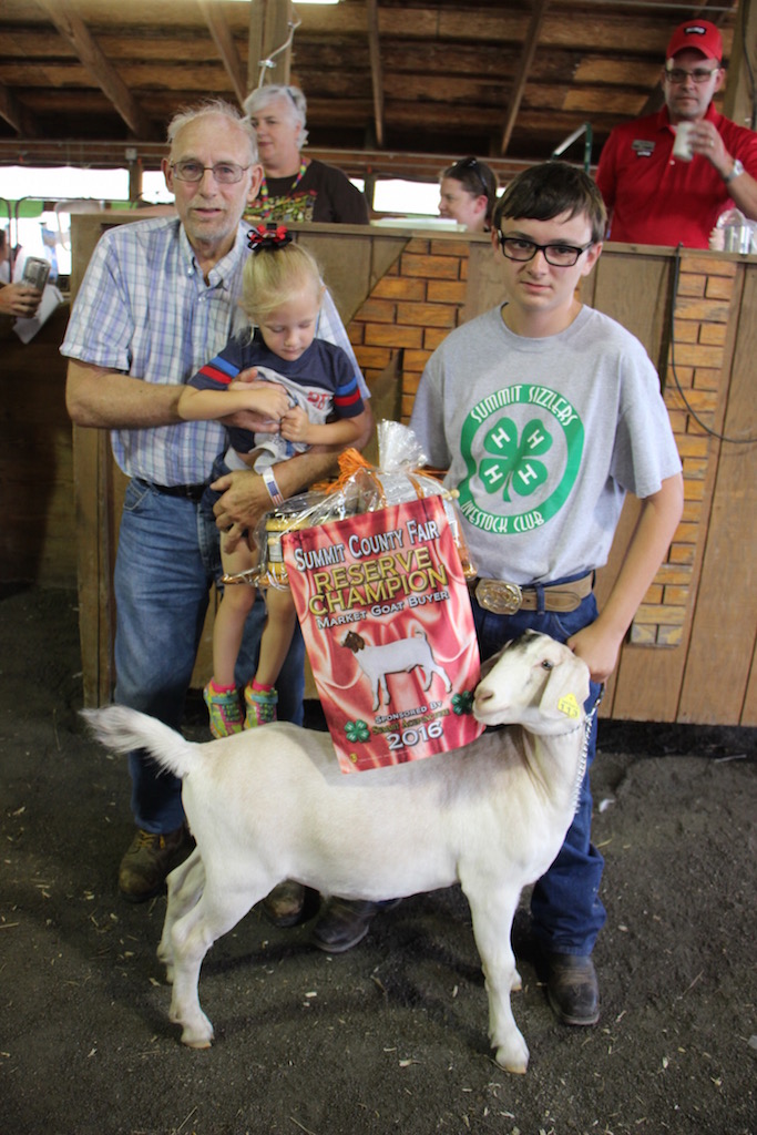 The Summit County Fair reserve champion market goat, weighing 89 pounds, was shown by Corey Soulek and purchased by Al and Leah Ahrens of Ahrens Club Pigs for $350.