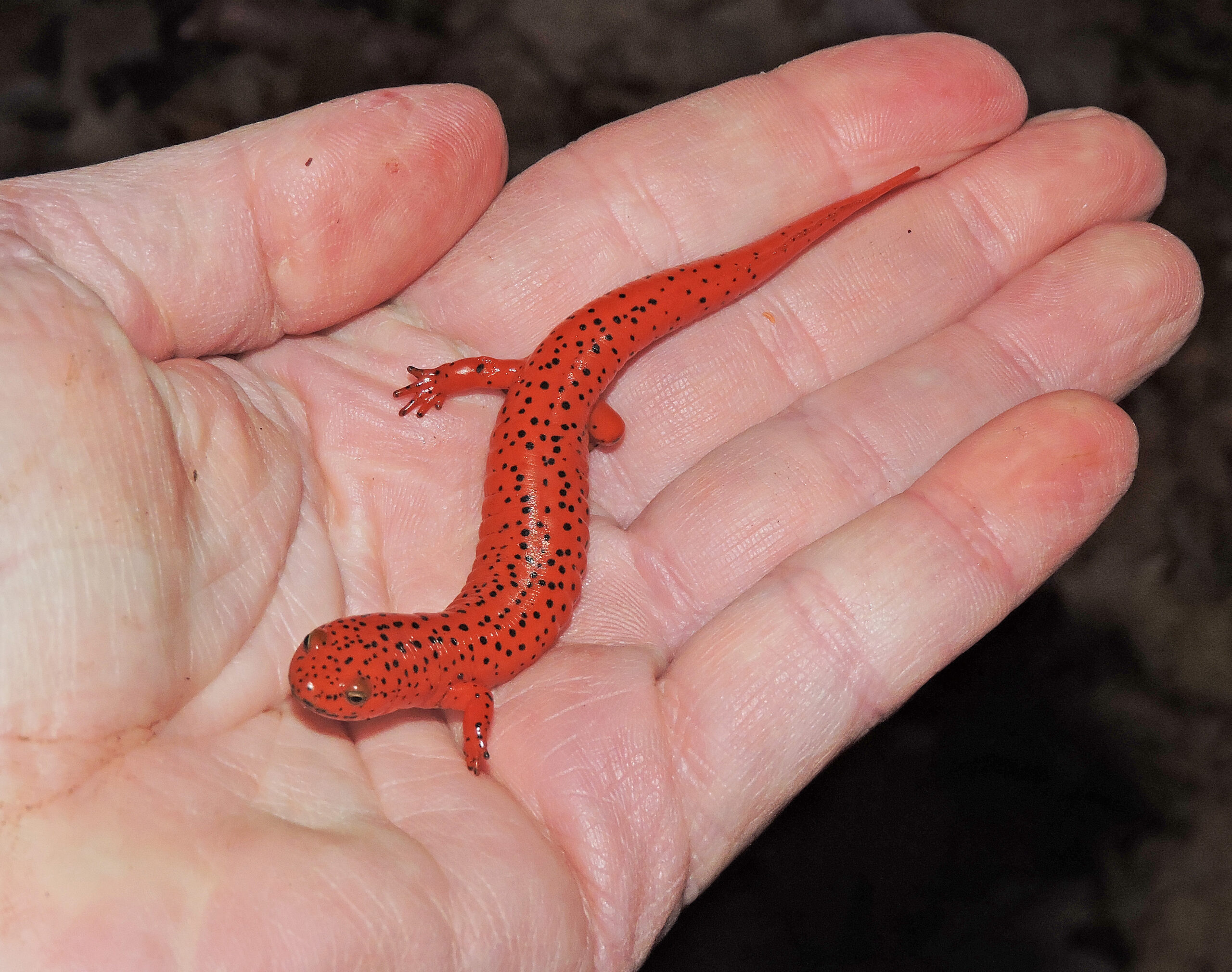 A few years ago, I was treated to an unexpected spectacle. On a warm, rainy afternoon in October, I was strolling along a woodland trail when a movement caught my eye. A beautiful northern red salamander (Pseudotriton ruber) was making its way across the forest floor. “Score,” I thought, bending down to examine the beautiful specimen and take some photos against the colorful leaves. Suddenly, another motion caught my eye, as a second red salamander ambled by. I snatched it up, adding it to the first one for a photo of the duo. Crazy as it seems, a few minutes later, I actually heard another, a big individual, moving with much determination through the leaves. The trio formed a perfect example of how the amphibians sport different colorations at different ages. While my little photo session was in progress, I observed many other red salamanders marching along, all headed in the same direction. Unlike spotted salamanders and Jefferson salamanders which are known for their extraordinary migrations into vernal pools in early spring, red salamanders are not known to exhibit mass movements, but this was the closest thing I’d ever seen.