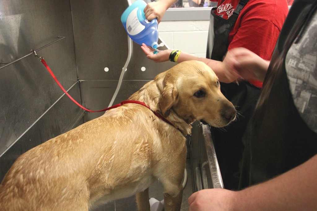 The SSCA animal science class offers a dog grooming service to the public. For $10, people can bring in their dogs for a wash and nail clipping. Heff is enjoying a wash from students Lexi Baer and Dylan Daulton.
