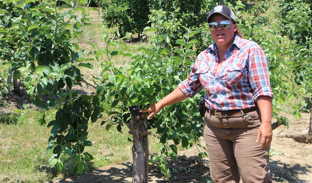 During a tour of Quarry Hill Orchards, in Erie County, June 22, part of the OPGMA summer tour, attendees learned how the Gammie family tried out new grafting techniques using existing tree rootstock. (Catie Noyes photos)
