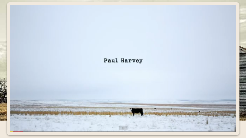 Then, on one of the commercial breaks, a photo of a solitary beef cow out in a snowy field commanded my TV screen. Silently, the name “Paul Harvey” appeared. And that familiar voice began.