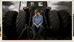 A young farm girl in a pink checked flannel shirt in a field. Heaping bins of sweet corn being harvested. A farmer hefting bales of hay from the back of his pickup. A couple behind their farm market stand. A closeup of a farmer’s hands. A wheat combine. A farm family at the dinner table.