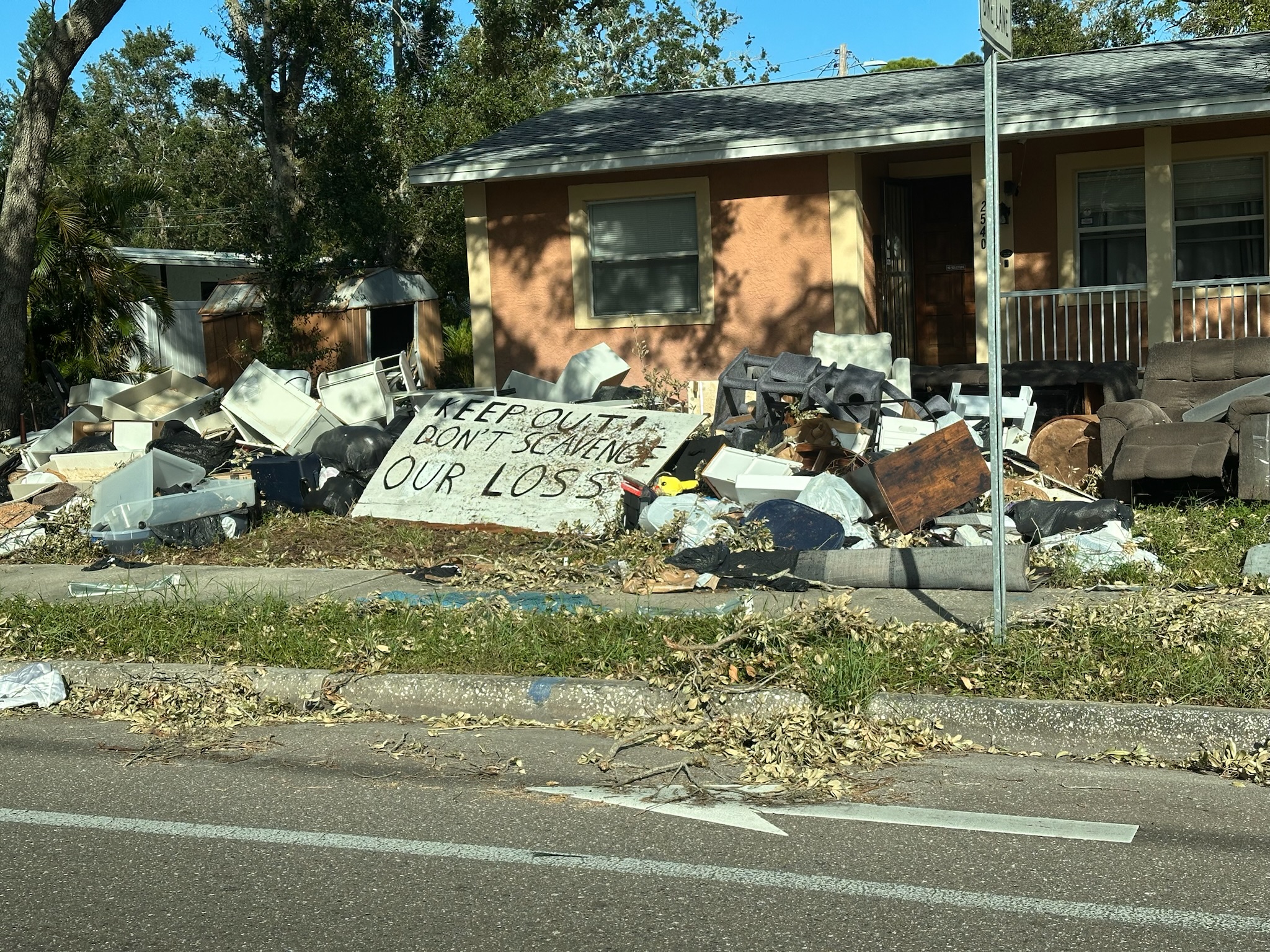 On Tuesday, Oct. 15, we woke early, packed our things, ate breakfast with the growing group and said our goodbyes. We drove to the beach, passing debris painted with calls for help and warnings, sunken boats and roofless Tropicana Field. We met a man showering at the beach and offered him the hygiene kits and food we had left. Then, we went home.