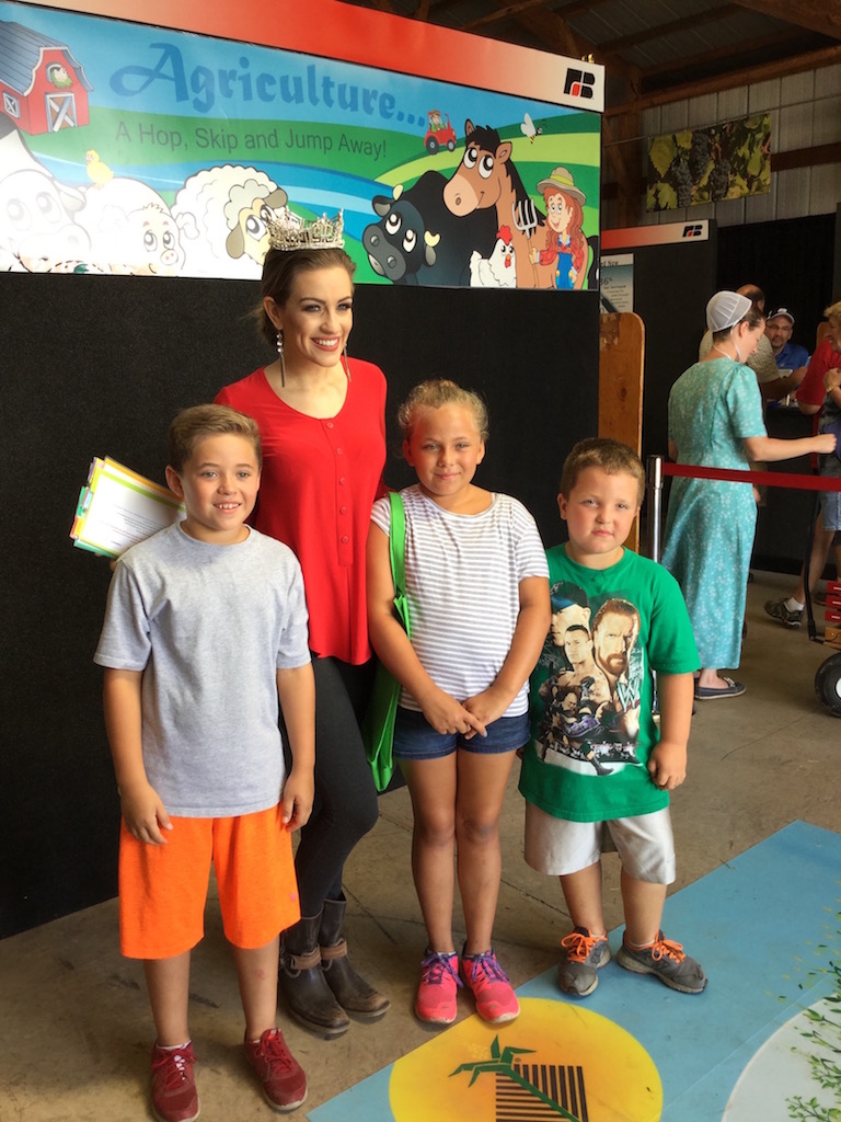 Samuel Fuentes, Gabriela Fuentes of Manassas, Virginia, and Levi Lonzendorfer of Northern Cambria, Pennsylvania, pose for a picture with Miss America. Susan Fuentes said she has been coming to Ag Progress Days since she was a little kid and now brings her own children.