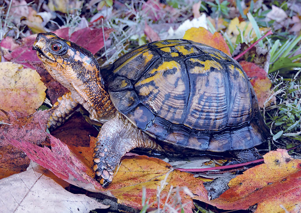 Terrestrial turtles, such as Eastern box turtles, often run the risk of being exposed to sub-freezing temperatures and other winter conditions. As autumn gives way to winter, these turtles must dig their way down beneath fallen logs or deep into the leaf litter where they create makeshift dens. As the cold creeps in, the turtles lower their metabolism considerably to conserve their energy. Some reptiles have a special antifreeze in their cells which prevents the growth of ice crystals.