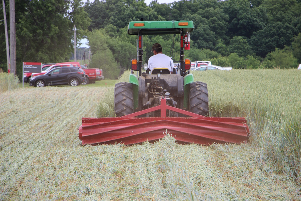 Crimping and rolling is another method of intercropping that can be done by rolling wheat and then planting soybeans or vise versa. This is a popular no-till method used often in organic systems. (Catie Noyes photo)