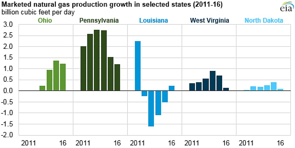 Louisiana, West Virginia, and North Dakota also increased their natural gas production in 2016. Louisiana’s increase was the first annual increase since 2011, while West Virginia and North Dakota have had 13 and eight consecutive years of natural gas production increases, respectively.