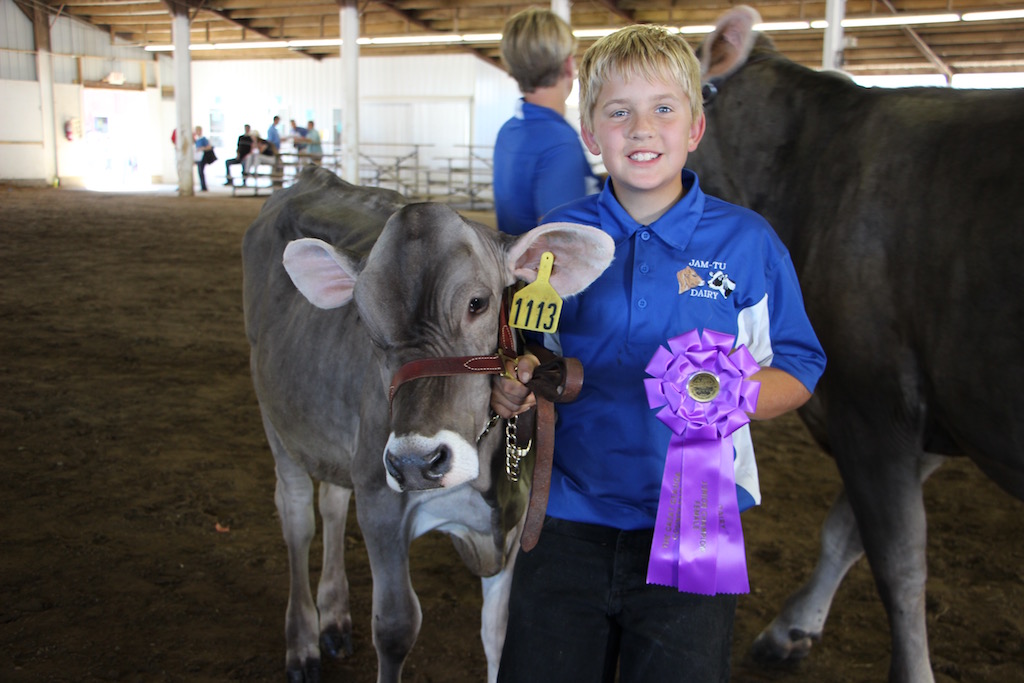 Colby Turner was all smiles when his Brown Swiss winter calf, Arabica, was named junior champion during the Brown Swiss show, Sept. 3, at the Geauga County Fair.