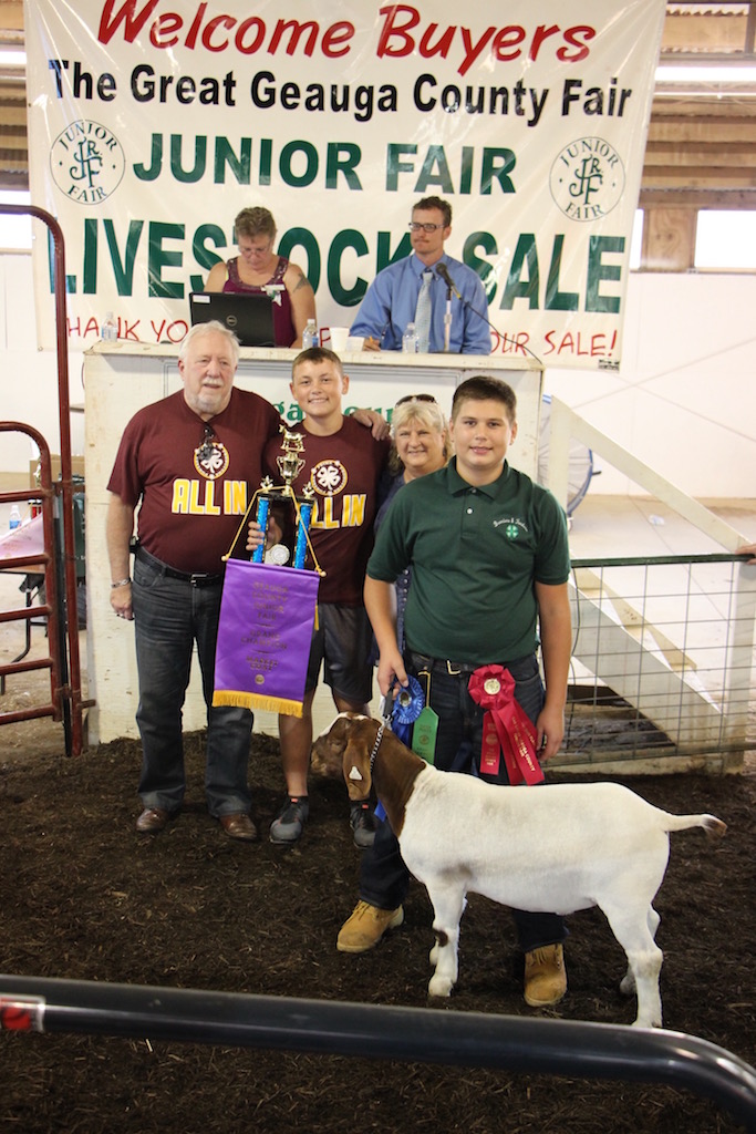 The Geauga County Fair grand champion goat, weighing 103 pounds, was shown by Mike Soltis and purchased by Green Family Funeral Home, represented by David Green, Karen Boyle and Cameron Longsford, for $18 per pound.