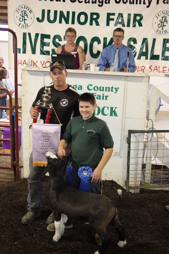 The Geauga County Fair reserve champion goat, weighing 91 pounds, was shown by Max Soltis and purchased by Mark Shaver of Del Davis Mechanical LLC, for $10.50 per pound.
