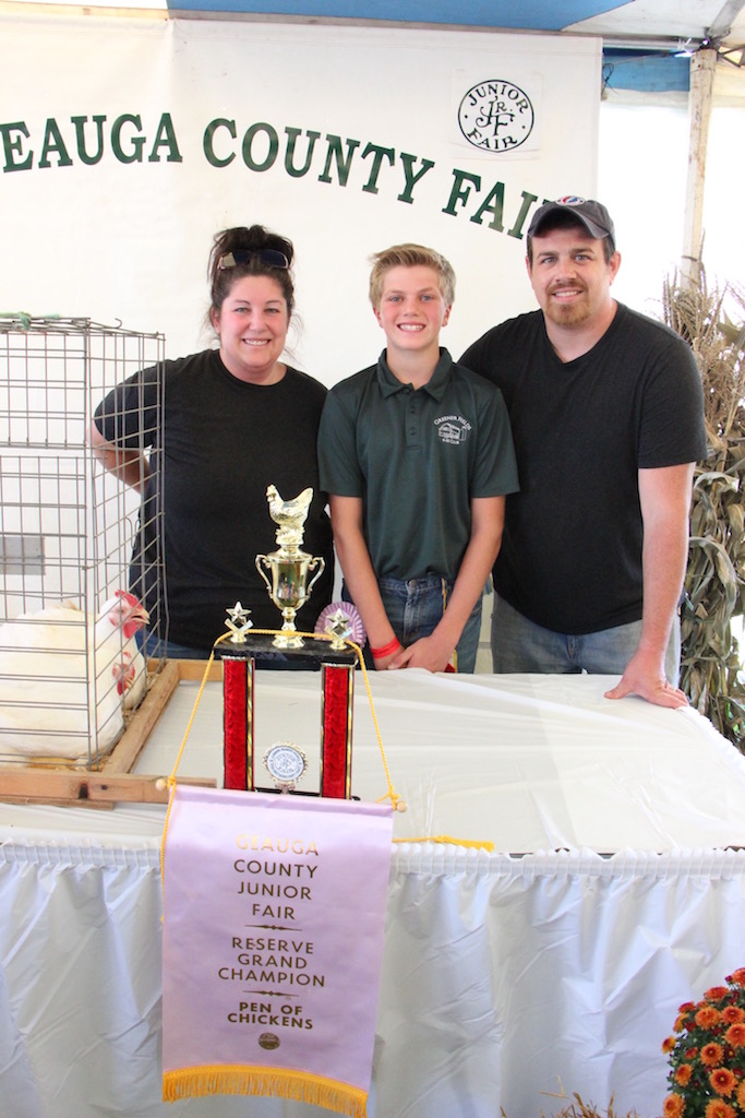 The Geauga County Fair reserve champion chicken pen, weighing 40.68 pounds, was shown by Dennis Bergansky and purchased by Kimberly and Jimmy Gibson of Hungry Bee for $70 per pound.