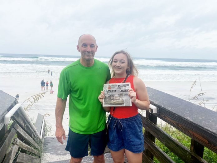 Bill Bryan and daughter, Mercedes, stand on the beach in Santa Rosa Beach, Florida, with Farm and Dairy. In the background, is the onshoring of Tropical Storm “Fred,” Aug. 16. Mercedes is a junior at Hillsdale College in Michigan, and the family farm is in Navarre, Ohio. (Submitted photo)