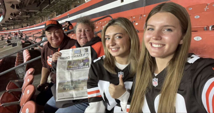 Jeff, Tracy and Jesse Vitek and friend Josey Meddles brought along Farm and Dairy on a trip to Cleveland to watch the Browns beat the Bengals on Monday Night Football. (Submitted photo)