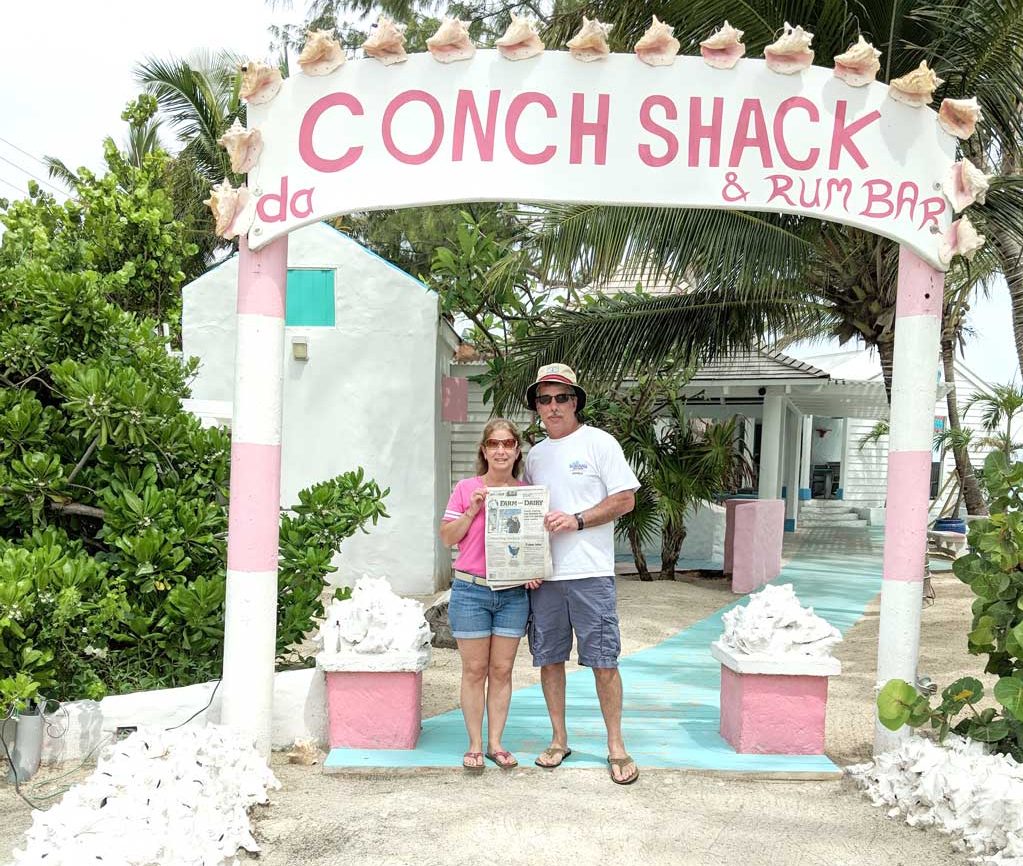 Paul and Laurie Willoughby of Wadsworth, Ohio, brought the Farm and Dairy to the beaches of Turks and Caicos Islands. While there they stopped in for lunch and to browse the paper at Da Conch Shack. (Submitted photo)