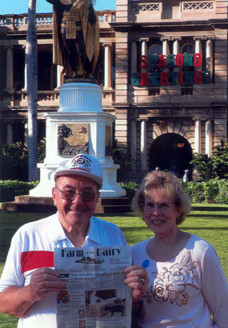 Farm and Dairy enjoyed the balmy weather while touring four islands and Pearl Harbor in Hawaii with Charles and Janice Adamski, of Aliquippa, Pa. King Kamehameha and his palace are in the background.