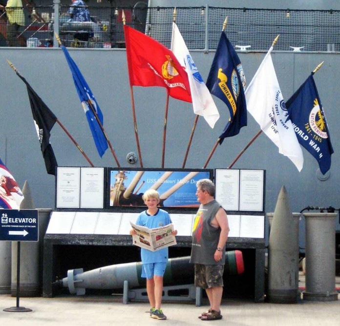 Randy Keene, Farm and Dairy newsstand delivery driver, of Salem, Ohio, stands in front of the USS Missouri with his grandson, Baker Schultz. Baker; his sister, Kaitlin; and his parents, Rae Ellen and Brad Schultz live in Hawaii while they are stationed on Oahu with the U.S. Army. Randy and his wife, Janet, visited the family in Hawaii and toured the Missouri as part of their tour of Pearl Harbor.