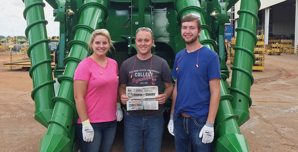 Pictured (L-R) are Sarah Bookman, Ashland, Ohio; Louis Liming, Lordstown, Ohio; and Joel Sonnenberg, Napoleon, Ohio. All three are students at Ohio State University and were in Brazil for a six-week study abroad program. The students are members of Alpha Zeta Partners, an agricultural honorary that requires each new class of members to complete a study abroad in Brazil. The students take classes at the University of Sao Paulo-ESALQ and take numerous tours of different farms and companies throughout the country. This picture was taken at a John Deere plant in Catalao City, Goias state, Brazil. The plant produces sugarcane harvesters and sprayers.