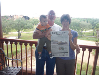Bob and Jane Morrow, of Plum, Pa., with grandson Robbie, stand on the balcony at Animal Kingdom Lodge at Disney World. It looks like Robbie has spotted an interesting story in Farm and Dairy!