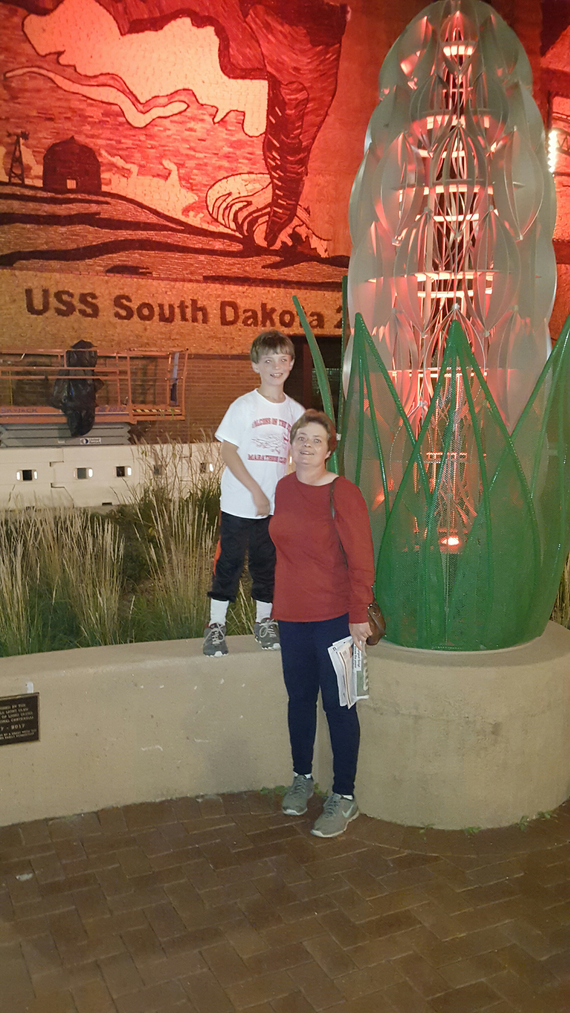 T.J. Logan and his mom, Lois McDowell, of Amherst, Ohio, enjoyed some time off outside the Corn Palace in Mitchell, South Dakota. They were in town Sept. 22 for T.J. to compete in the National Pedal Tractor Pull Championship.