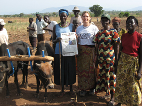 In 2008, Farm and Dairy ran a story on the Cross Border Animal Power Project for Peace, which is a program that teaches ox-driving skills to people in war-torn Uganda. Vicki Solomon of Huntsburg, Ohio, (second from left) was one of the instructors. She remembered to take Farm and Dairy along on her adventure and posed for this pictured in Lokung, Uganda. Solomon said the worldwide economic crisis is affecting the supply of emergency food aid to this region, making it more critical than ever for people there to learn how to use ox power for food production. Solomon may return to Uganda this summer through the program, which is now called Peace Harvest.
