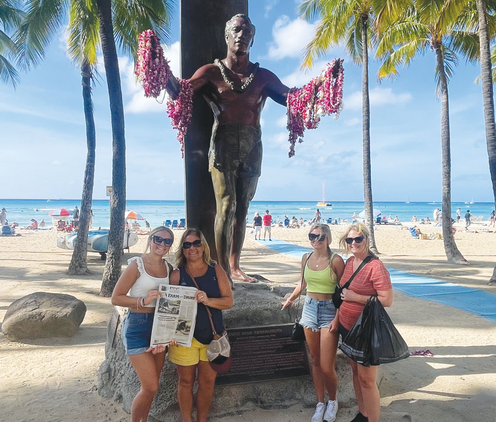 Farm and Dairy went to Hawaii with Denise Rhodes and her daughter, Rachael, who marched and cheered in the Pearl Parade with Varsity Spirit. Rachael was selected as an All-American in July at the UCA cheer camp. From left to right: Rachael and Denise Rhodes and Aubrey and Angela Benner, all of Salem, Ohio, pictured with the Duke of Waikiki Beach in December.