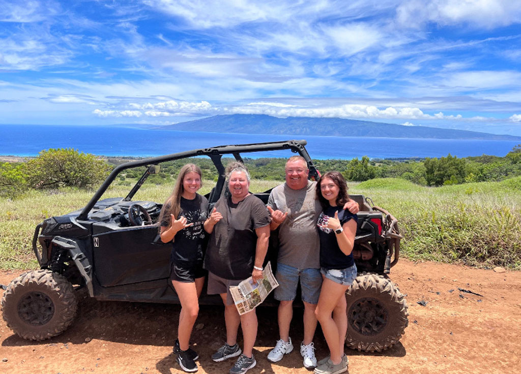 Jeff, Tracy and Jesse Vitek and friend Josey Meddles brought along Farm and Dairy when they vacationed in Hawaii on the island of Maui. They enjoyed a luau and an ATV ride in the countryside. (Submitted photo)