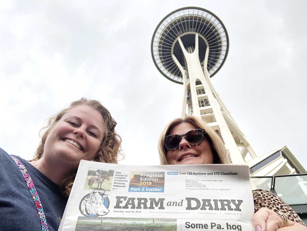 Stephanie Cope, of Alliance, Ohio, (right) and daughter, Sam Muniz, of Lisbon, Ohio, took Farm and Dairy to Seattle. They are pictured in front of the Space Needle, the 1962 World’s Fair legacy and Seattle’s most iconic landmark.